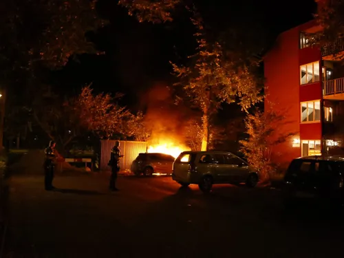 Er bleek aan de Abdijlaan in Uden een geparkeerde auto aan de voorzijde in brand te staan. De politie die als eerste ter plaatse was, heeft bij de flat aldaar de bewoners wakker gebeld, om de geparkeerde auto's langs die autobrand te verwijderen. Een personenauto is hierdoor verwijderd. Ondanks de snelle inzet van de brandweer kan de auto als verloren worden beschouwd. Een bergingsbedrijf zal de auto komen takelen. Hoe de brand is ontstaan is niet bekend. Een andere geparkeerde personenauto is door de vlammenzee beschadigd geraakt. Wat de schade is is niet bekend.