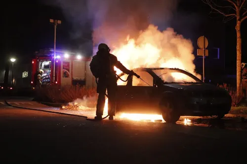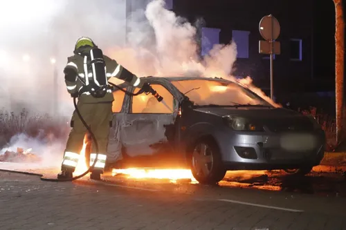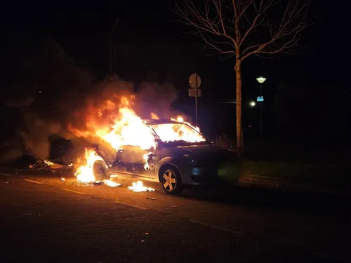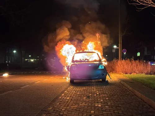 Een auto staat op nieuwjaarsnacht volledig in brand op de Leeuweriksweg in Uden