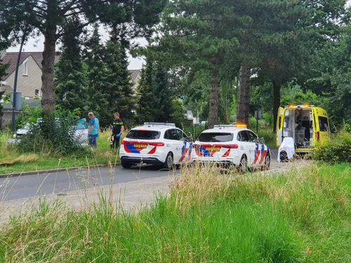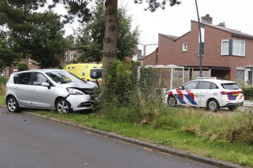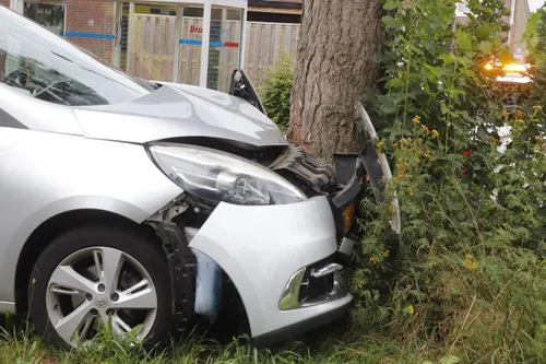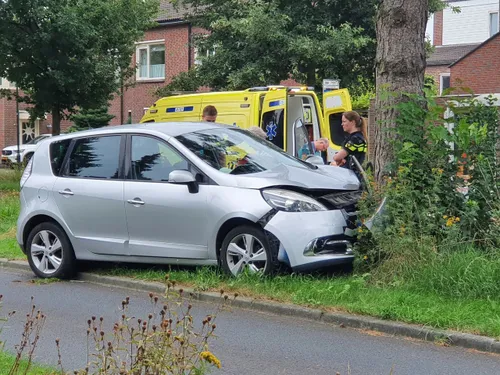 Een auto is donderdagochtend door nog onbekende oorzaak op de Mellesingel in Uden van de weg geraakt en in de middenberm tegen een boom gebotst.