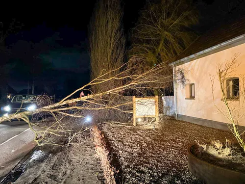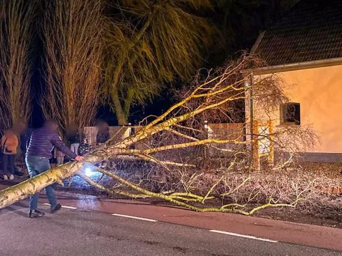 Er bleek een boom door de storm geheel uit de grond getrokken te zijn. Deze blokkeerde hierdoor de doorgaande weg en kwam net voor een woonhuis terecht. Hierdoor bleef het huis op een haartje na bespaard. De brandweer heeft de boom in stukken gezaagd, waardoor de weg weer toegankelijk was voor verkeer.