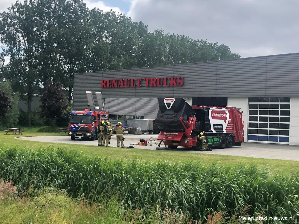 Een elektrisch aangedreven vrachtwagen van het bedrijf Van Kaathoven heeft door onbekende reden vlam gevat. Mogelijk stond deze vrachtwagen daar ter reparatie.