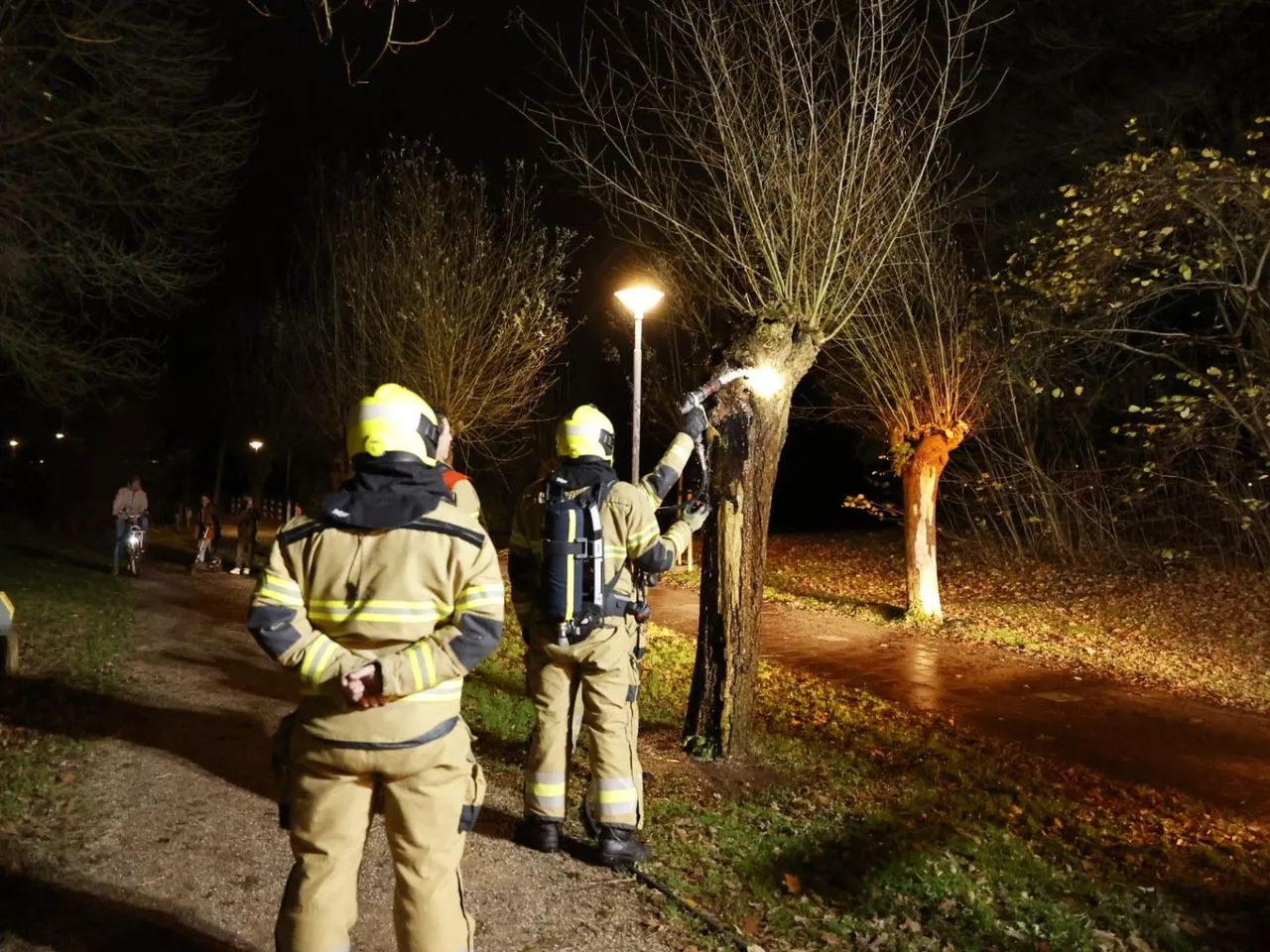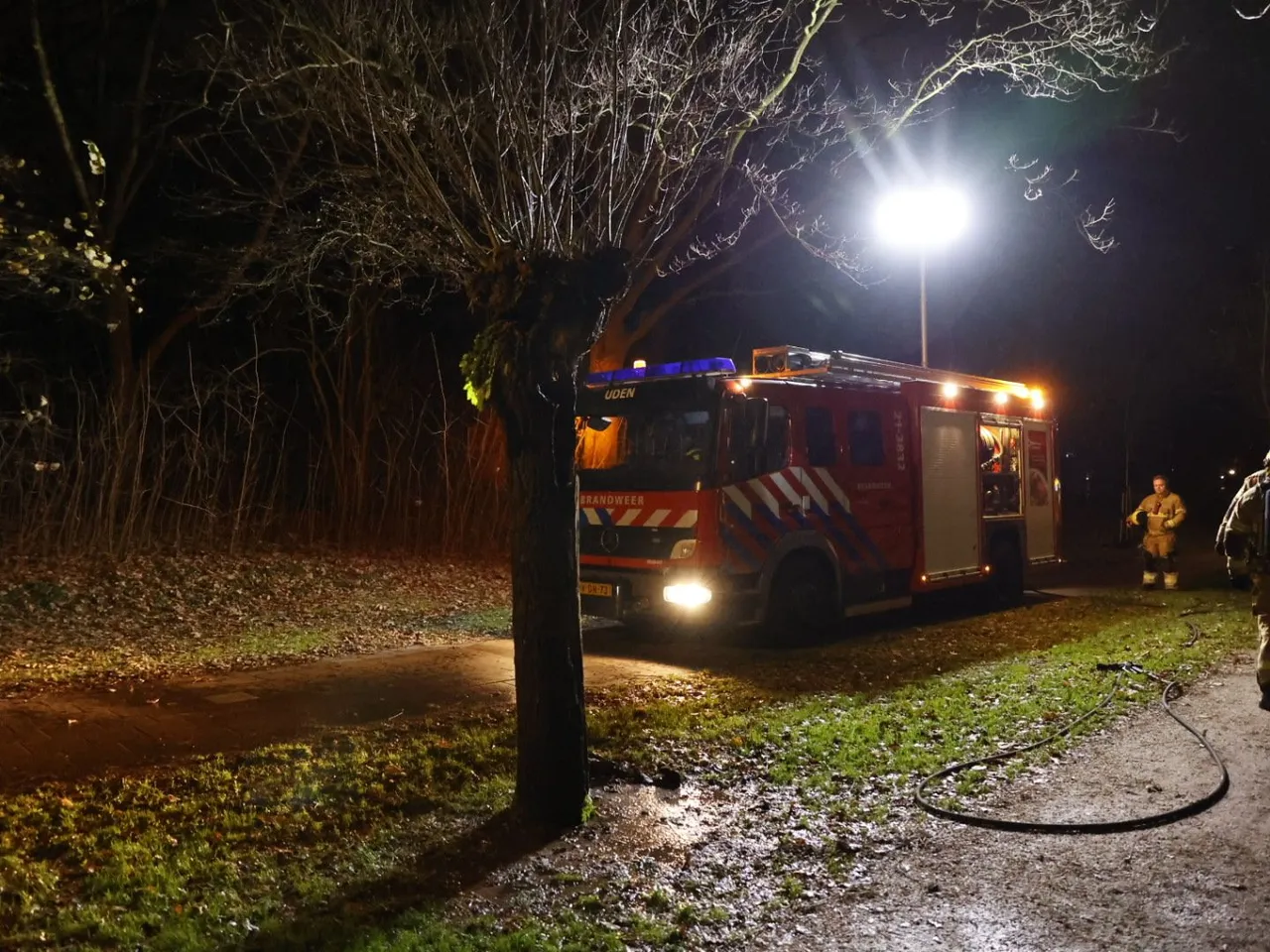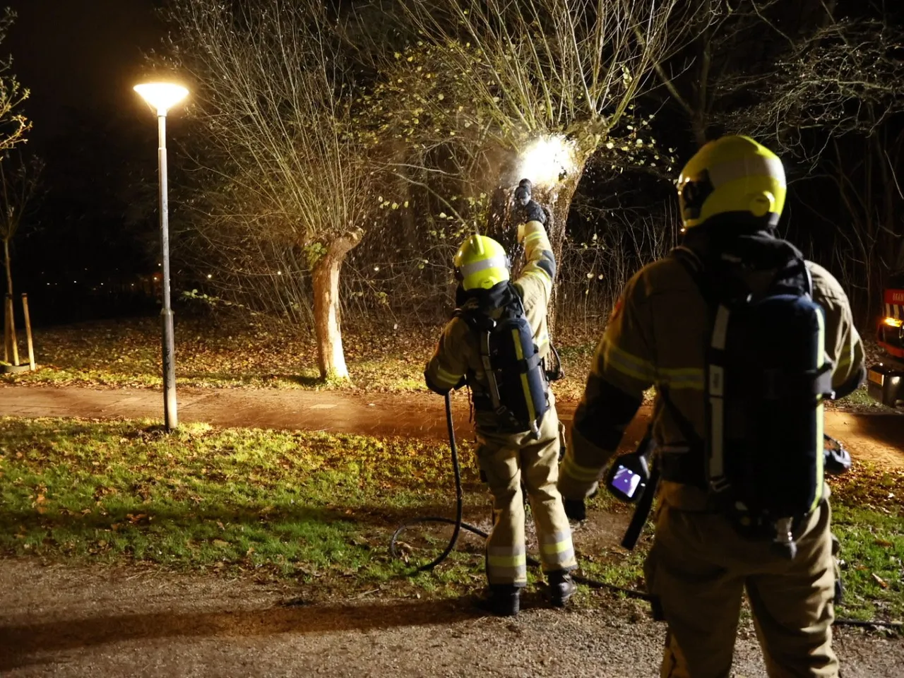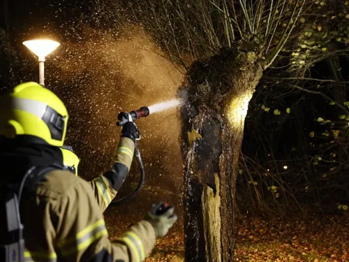Ter plaatse treft men een boom in brand in het park bij een brugje aan de Drossaard. Omstanders zag rook uit de boom komen en hebben de hulpdiensten gebeld. Met een straal hoge druk was men de brand snel meester. Hoe de brand kon ontstaan is niet bekend.