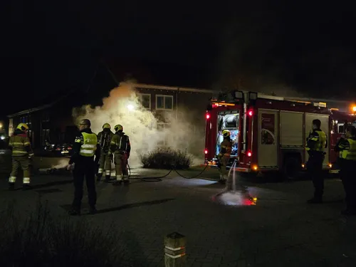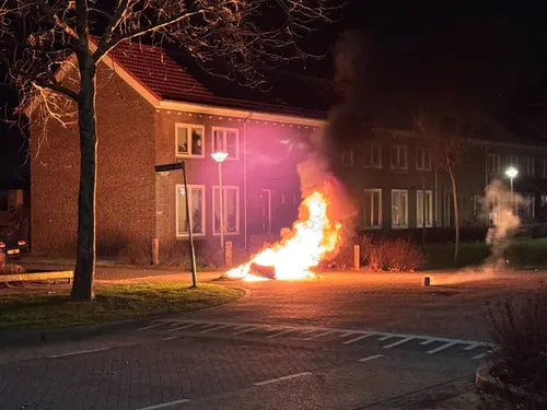Omwonenden hadden op oudejaarsavond een grote vuurstapel op straat aan de Leeuweriksweg in Uden gemaakt.