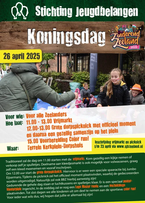 Zeeland kleurt oranje! SJB zorgt weer voor een oranje topfeestje deze Koningsdag. Met een terras, Kleedjesmarkt, Dorpspicknick, Muziekbingo, Peuter- en kleuterplein, Springkussens, Colorrun en LegoMaster Event is er weer van alles te doen op en rond het kerkplein, voor jong en oud! De dag wordt georganiseerd voor alle inwoners van Zeeland, met als doel er samen weer een topfeest van te maken! We nodigen bij deze dan ook graag iedereen uit om deel te nemen aan deze dag!