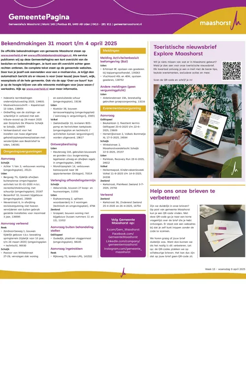 Wekelijks verschijnen er officiële bekendmakingen van de gemeente Maashorst.