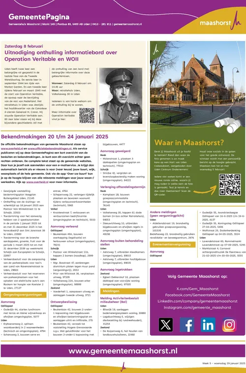 Blijf op de hoogte via maashorst.nieuws.nl van de bekendmakingen van de gemeente Maashorst met betrekking tot vergunningen en procedures. Wekelijks verschijnt de informatiepagina op deze nieuwssite.