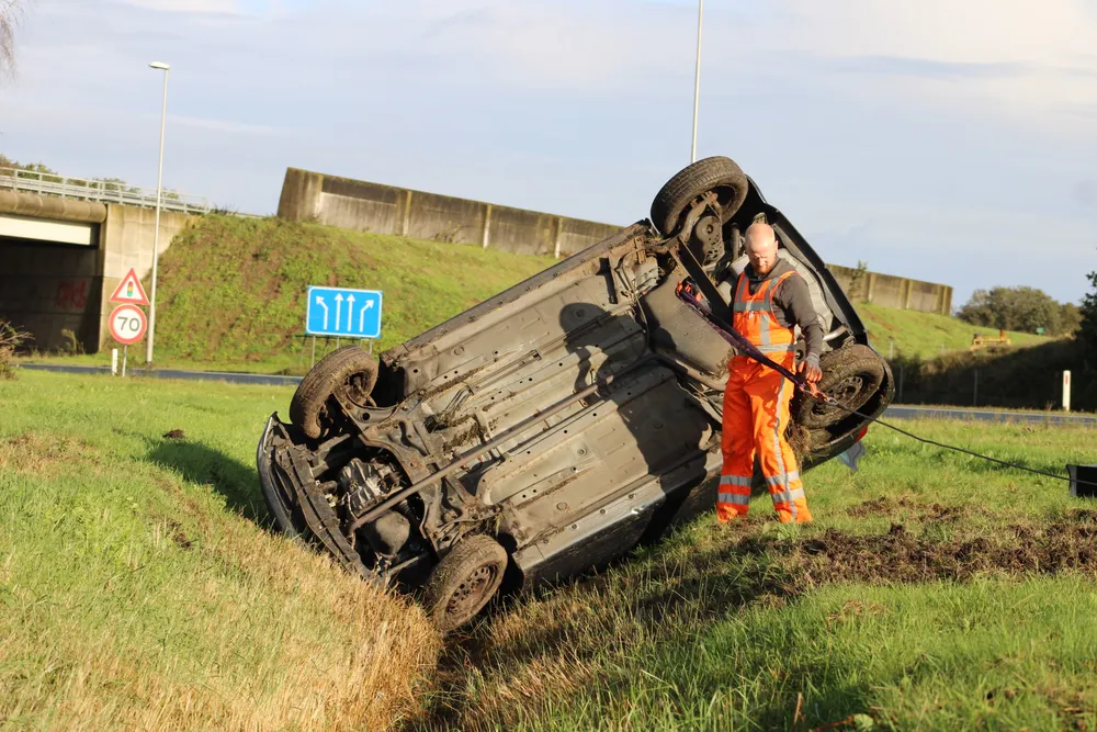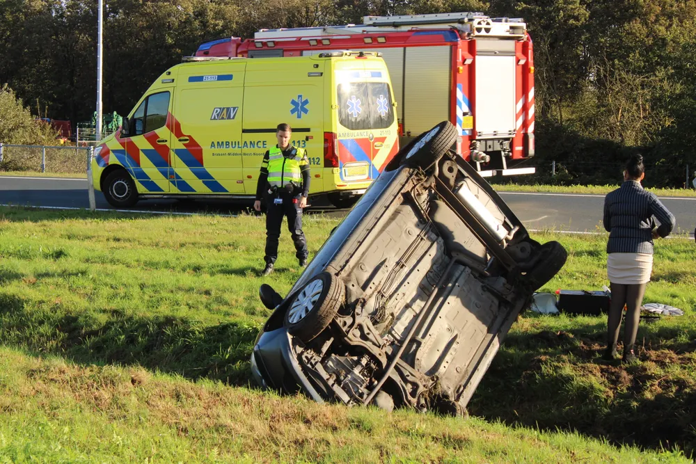 Op de A50 bij de afrit Paalgraven is een auto over de kop geslagen en in de sloot belandt.
