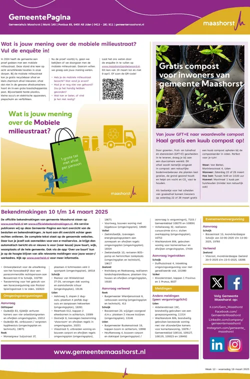 Wekelijks verschijnen er officiële bekendmakingen van de gemeente Maashorst.