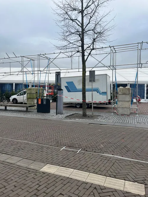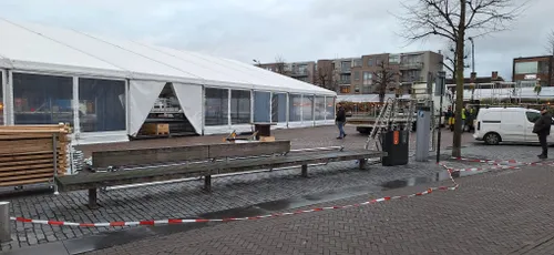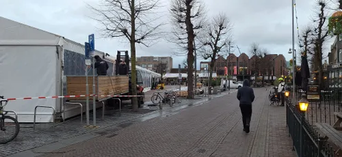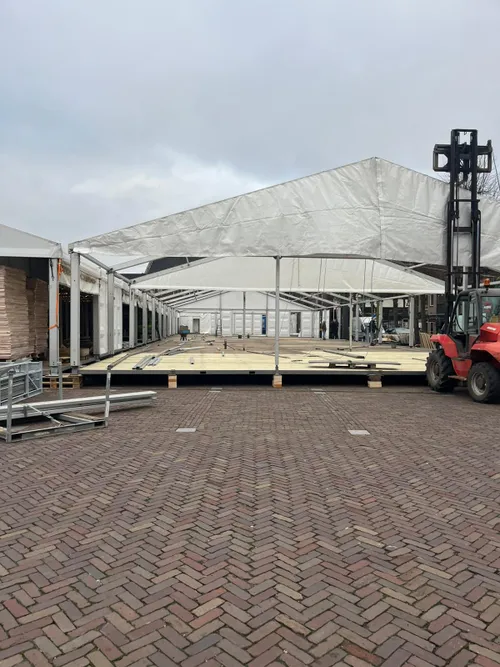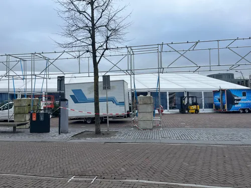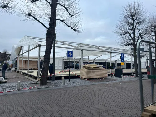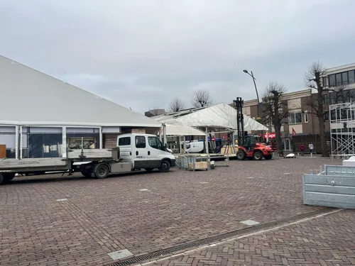 Vandaag werd gestart met de opbouw op de Markt met 900 m² overdekte ijsbaan, horecatent, Schrobbelèrtent en tubebaan.