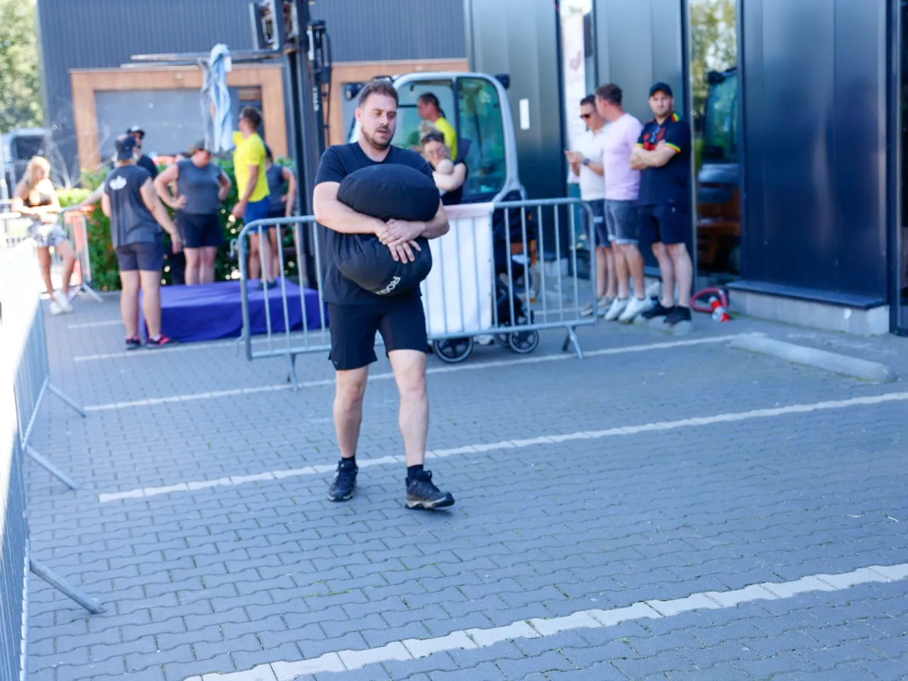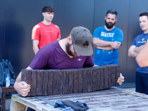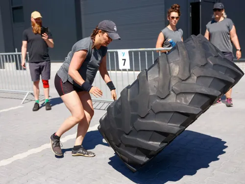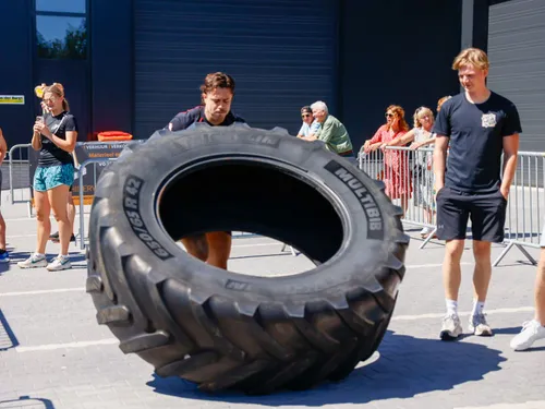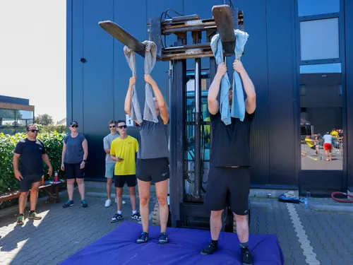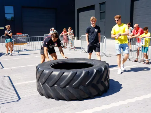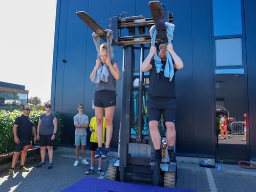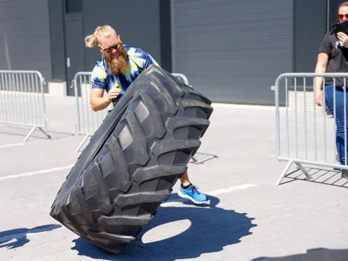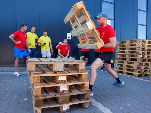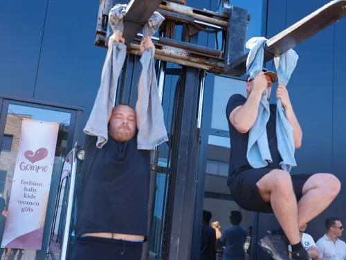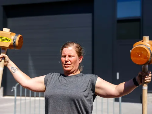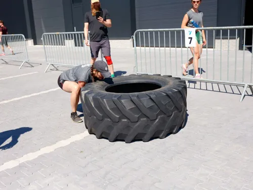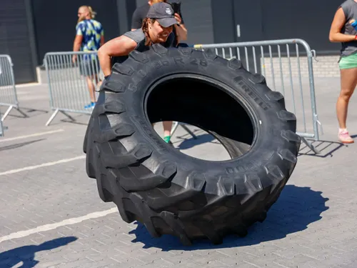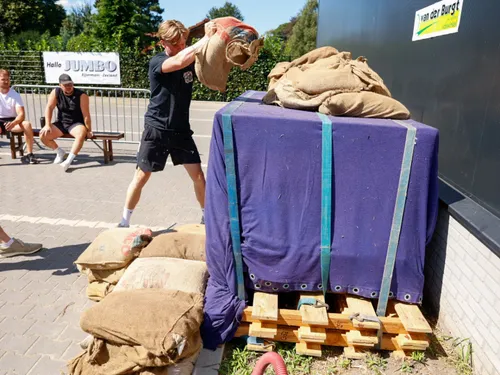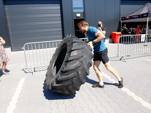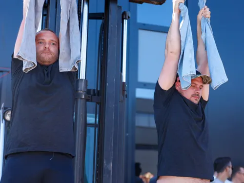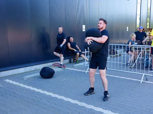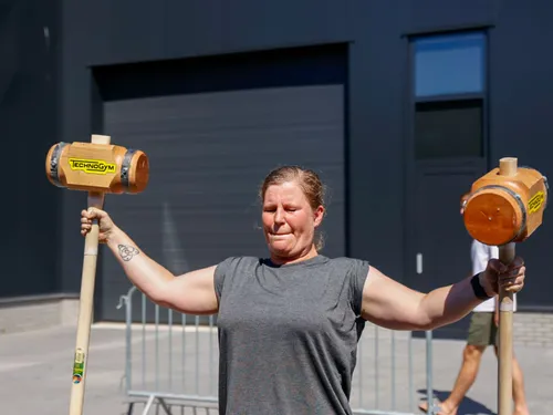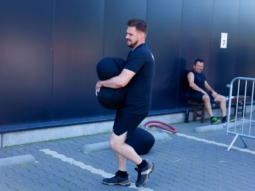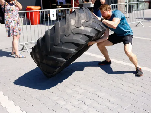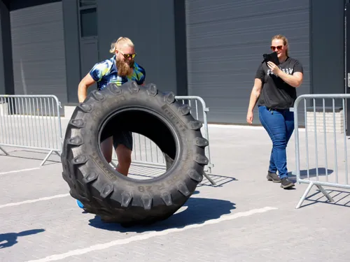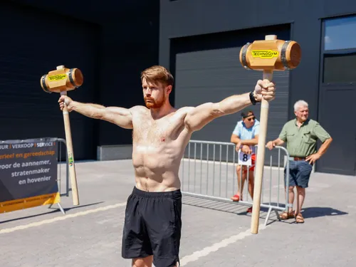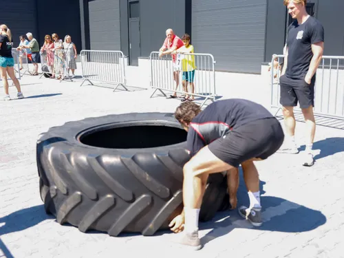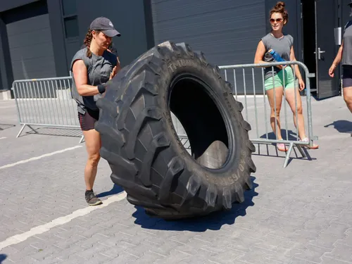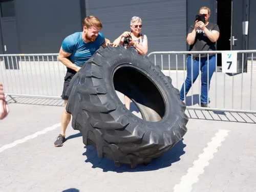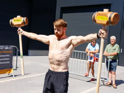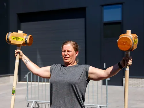 Vrachtwagen trekken, spijkerbroek hangen, hamers heffen, zandzakken tillen, pallets stapelen, bakstenen klemmen, lopen met zandzak, tractorbanden flippen