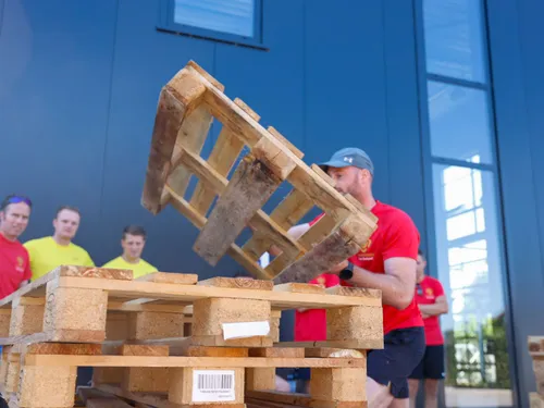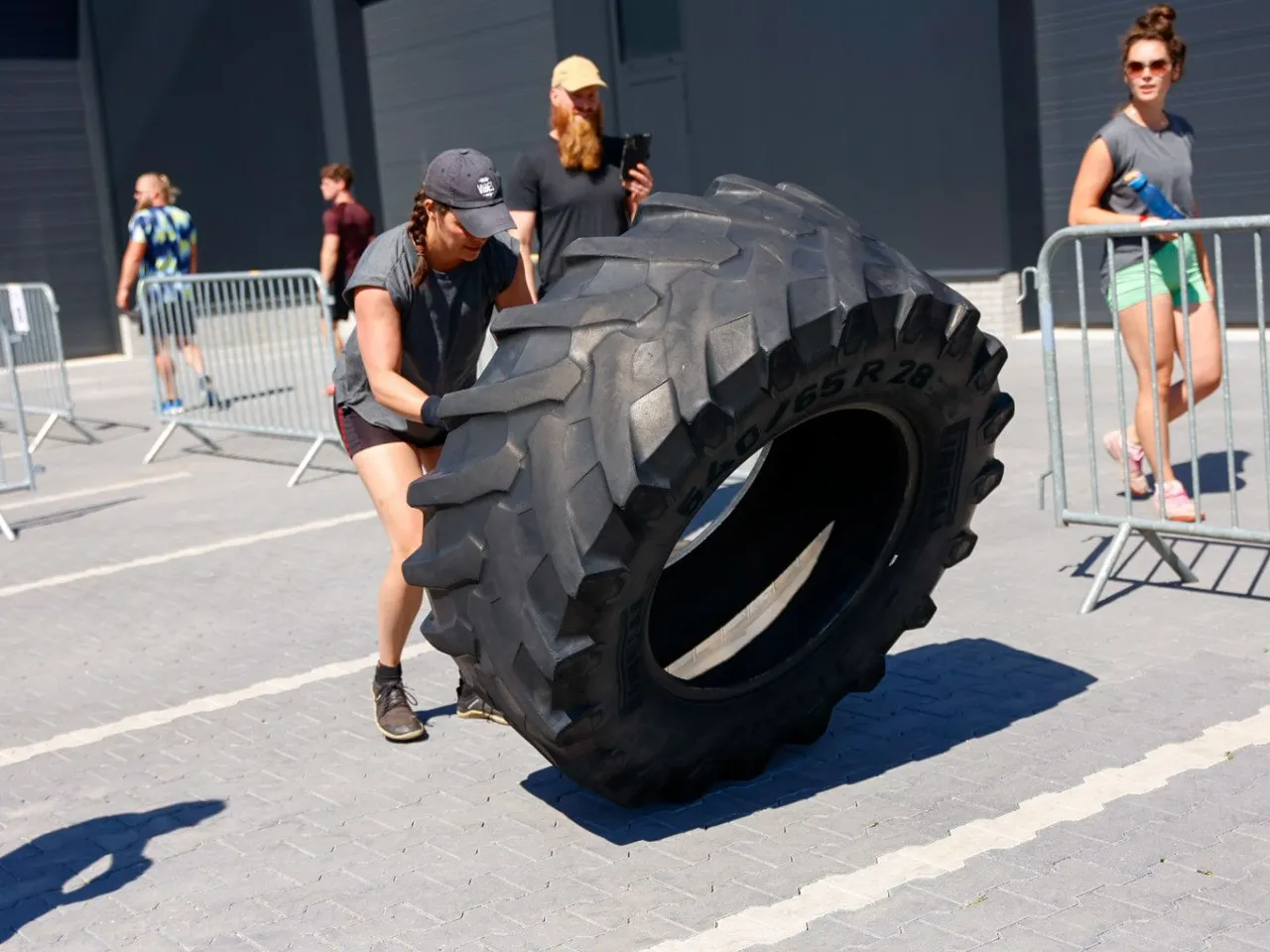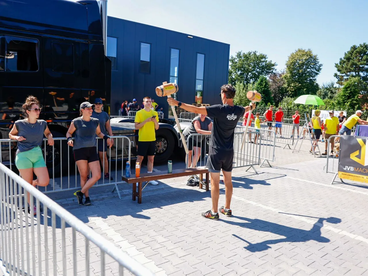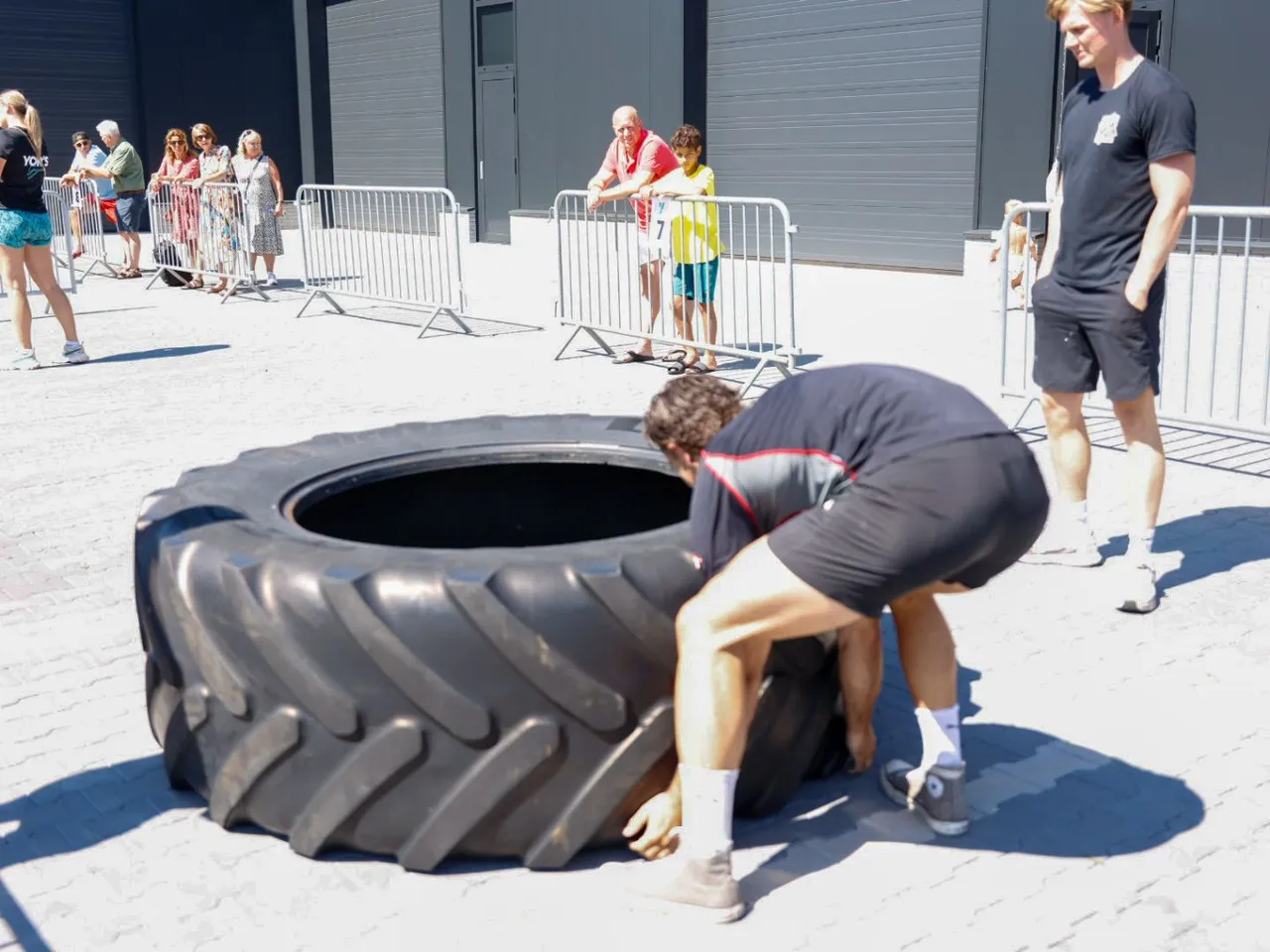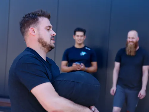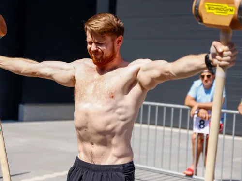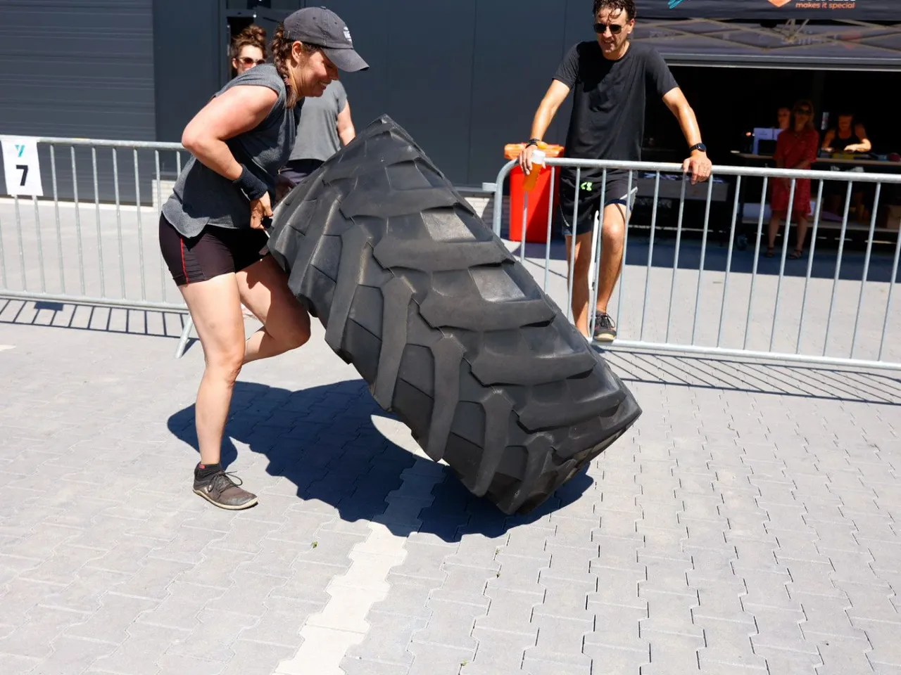 Vrachtwagen trekken, spijkerbroek hangen, hamers heffen, zandzakken tillen, pallets stapelen, bakstenen klemmen, lopen met zandzak, tractorbanden flippen