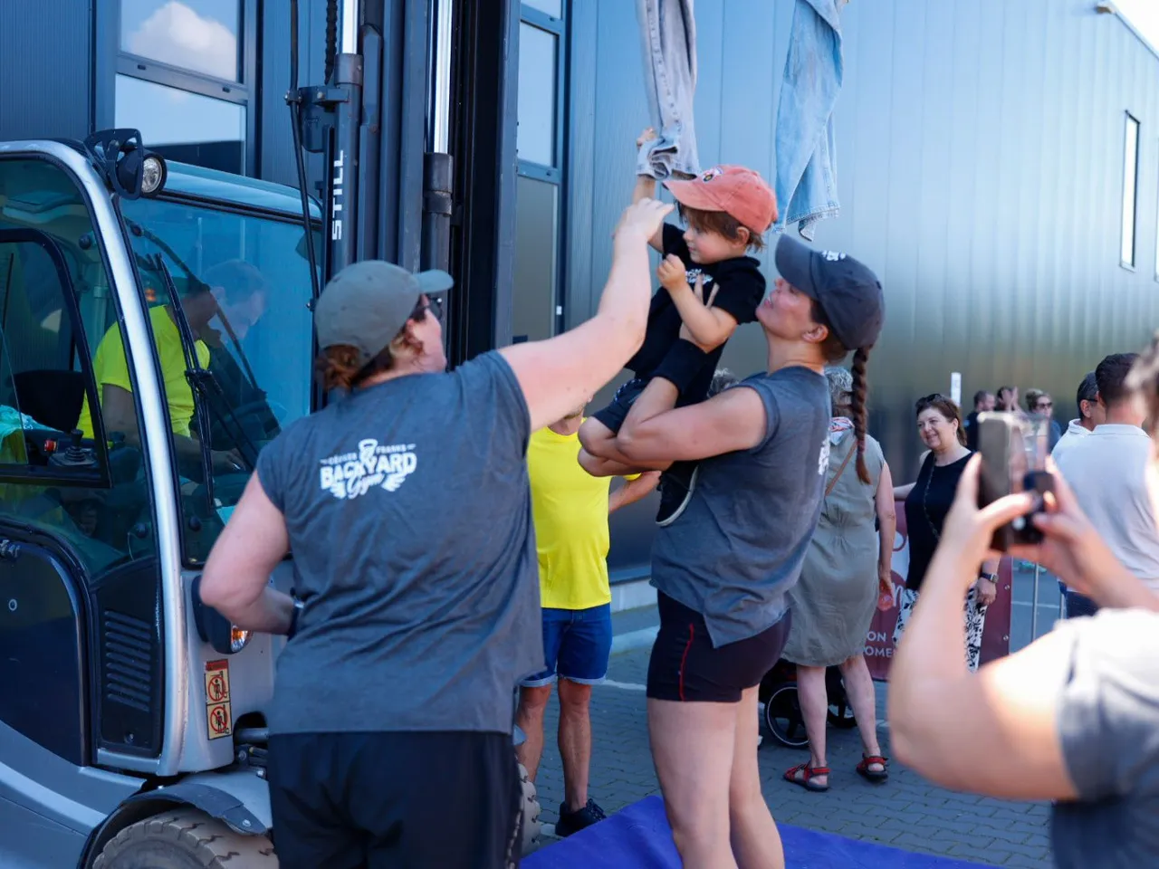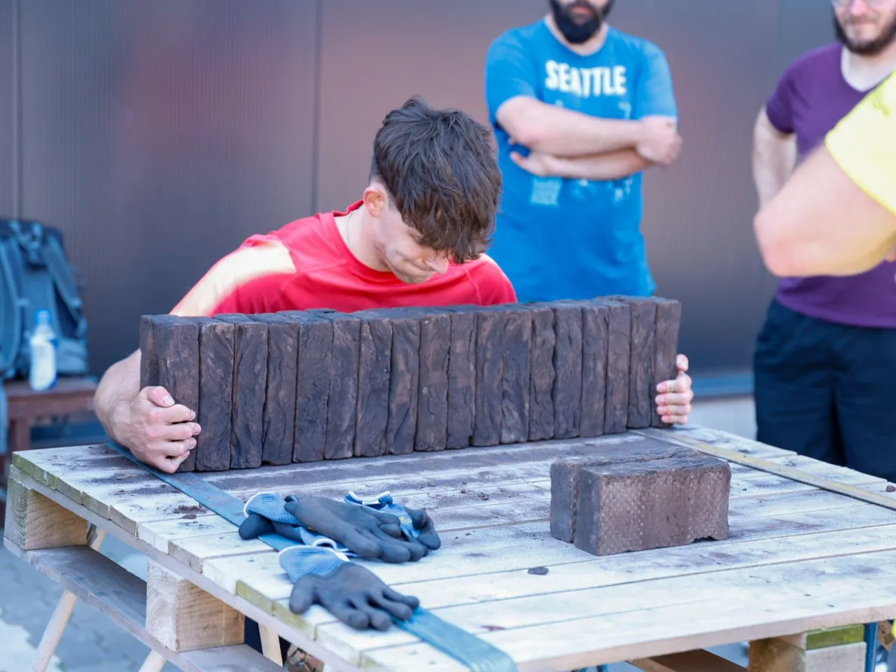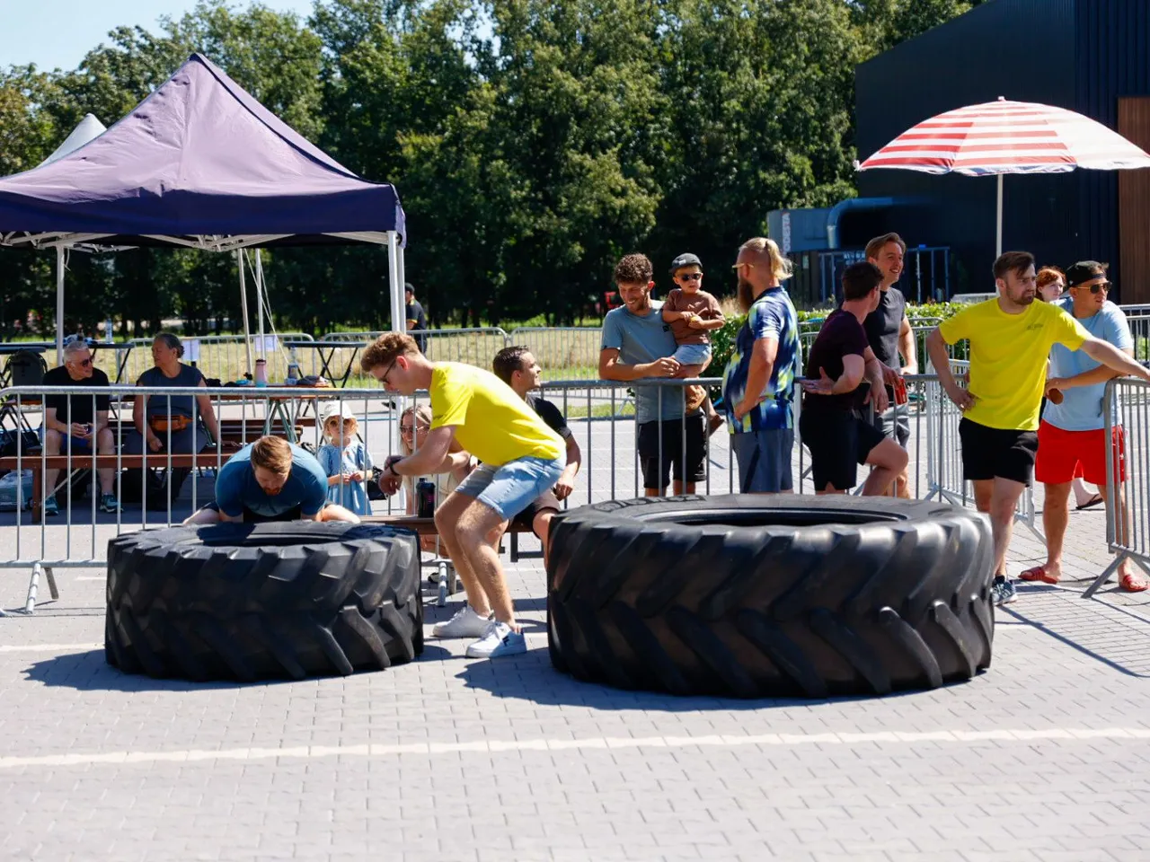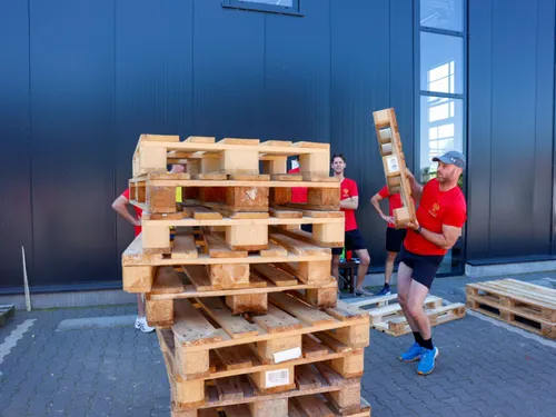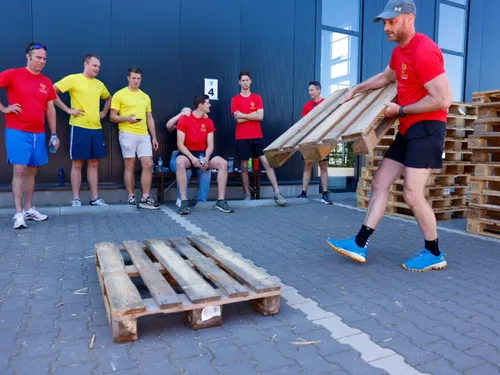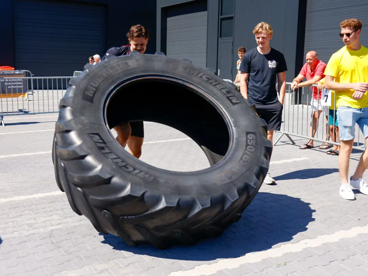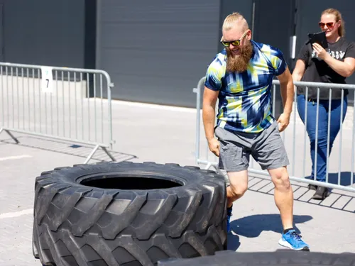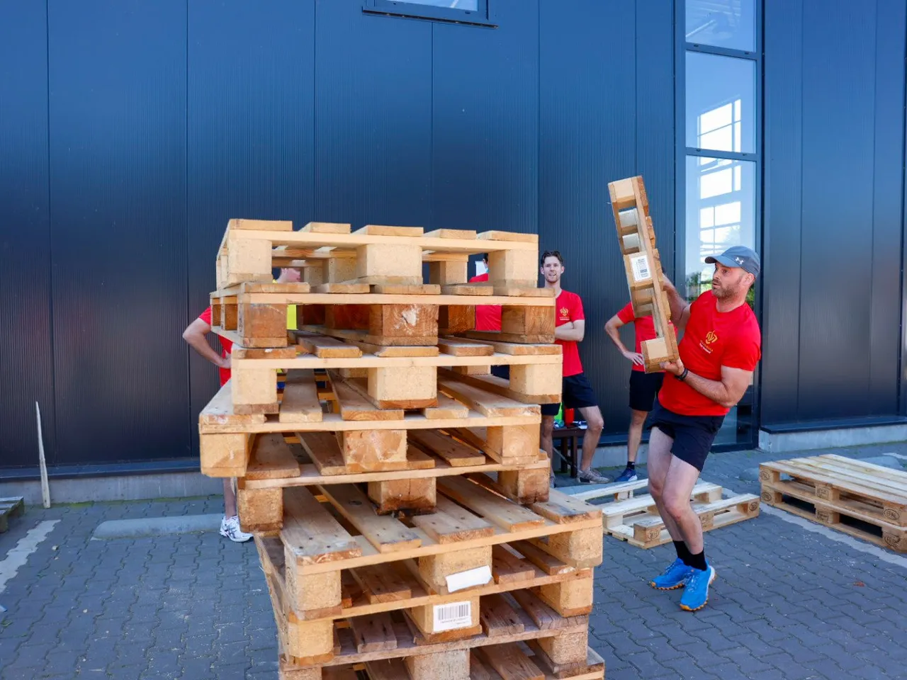 Vrachtwagen trekken, spijkerbroek hangen, hamers heffen, zandzakken tillen, pallets stapelen, bakstenen klemmen, lopen met zandzak, tractorbanden flippen