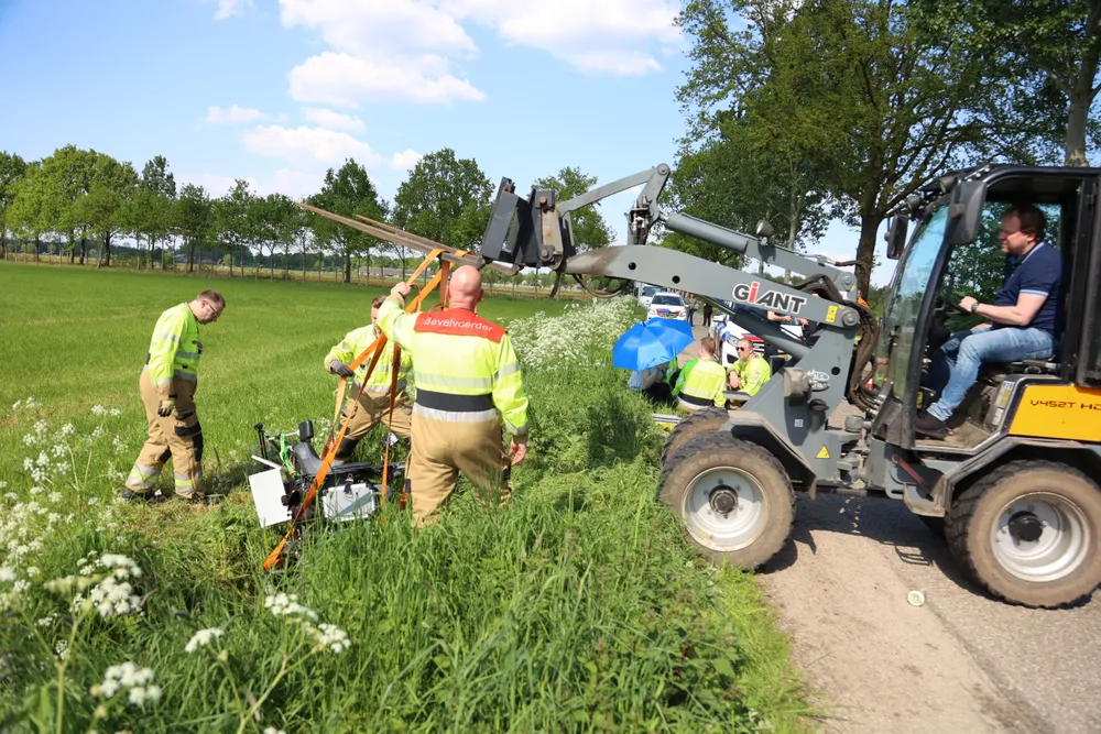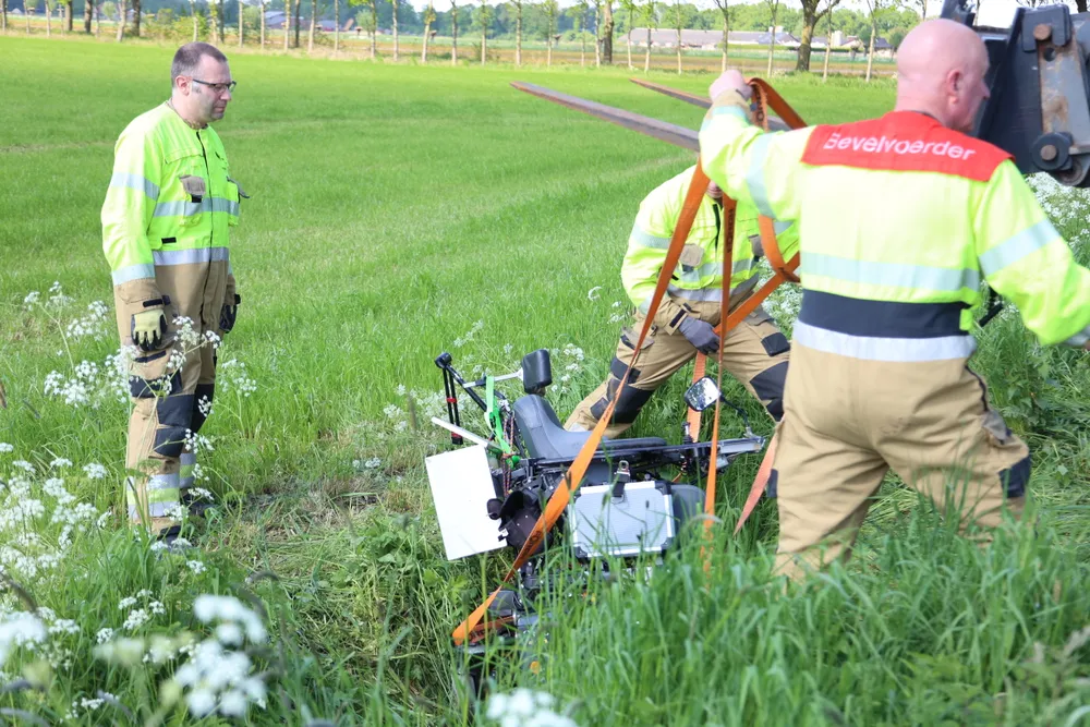 Hoe dit kon gebeuren is niet bekend. Omstanders en buurtbewoners hebben de man geprobeerd uit de sloot te halen, en uiteindelijk samen met brandweer gered. De elektrische rolstoel is met een loader uit de sloot getild. De man is nagekeken door personeel van een rapid-rasponder.