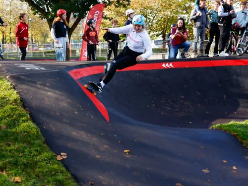 Pumptrack in Uden is zaterdagmiddag geopend aan het Bevrijdingspark in Uden. Wethouder Jeroen van de Heuvel opende de baan door zelf een poging te wagen met een skateboard.