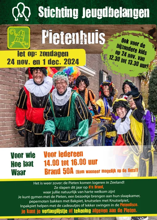 Op zondag 24 november en op zondag 1 december zijn jullie weer welkom in het Zeelandse Pietenhuis. Dit jaar slapen de Pieten op Brand 50A. Iedereen is op de twee zondagen welkom om een bezoekje te brengen aan het Pietenhuis. Je kunt een kijkje nemen in de slaapkamer van de Pieten, maar ook in die van Sinterklaas, want ook die blijft wel eens logeren. De Bakpiet heeft dit jaar een eigen bakkerij in het Pietenhuis en heeft zeker hulp nodig in deze drukke tijd! Ook de Inpakpiet heeft het druk en kan hulp gebruiken. Wanneer je hiermee klaar bent, dan kun je met de Knutselpiet iets leuks maken. Om net als de Pieten lekker fit te blijven, kun je ook weer meedoen met de Pietengym. Vergeet ook zeker niet je adres even door te geven aan de Piet bij de grote landkaart. Natuurlijk is er ook tijd om met je favoriete Piet op de foto te gaan. Het Pietenhuis is beide zondagen geopend van 14.00 uur tot 16.00 uur. Jullie komen toch ook?!