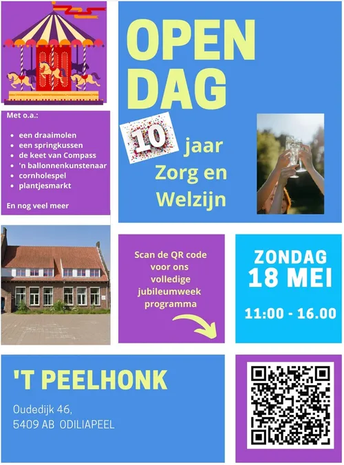 ODILIAPEEL | Dit jaar is het 10 jaar geleden dat stichting Zorg & Welzijn Odiliapeel met de voorbereidingen is gestart. Het bestuur wil dit jubileum groots vieren met een feestweek, die op zondag 18 mei start met een Open Dag. Tijdens deze dag, voor álle inwoners van Odiliapeel, wordt van 11.00 tot 16.00 uur een inkijkje gegeven in de organisatie. Er zijn die dag in en rond ’t Peelhonk diverse activiteiten voor jong tot oud. De officiële opening is om 11.30 uur, waarbij de nieuwe naam van Zorg & Welzijn wordt onthuld. De toegang is gratis, iedereen is van harte welkom.