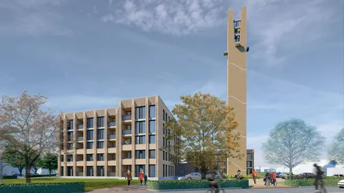 De kerktoren blijft behouden; historische elementen zoals de glas-in-betonramen worden geïntegreerd in het nieuwbouwontwerp.
